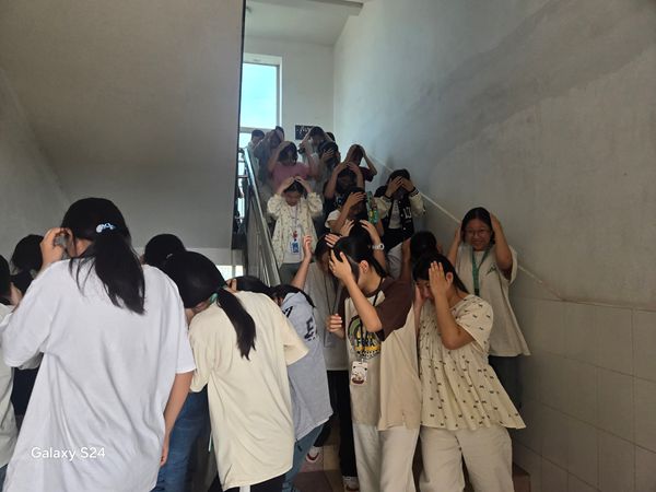 随着第一声警报拉响,演练正式开始。教室内,正在上课的师生迅速反应,老师们立即指挥学生就近躲避在课桌下。双手护头,蜷曲身体,降低重心,利用课桌有效保护身体重要部位。待“地震波”稍缓,第二声警报响起,在班主任和楼层引导员的有序指挥下,学生们按照预定疏散路线,双手护住头部,弯腰低姿,快速、有序地撤离教学楼。整个过程中,师生们分工明确、配合默契,未出现拥挤、推搡现象。从警报响起到全体师生安全撤离至操场指定位置,用时2分钟。