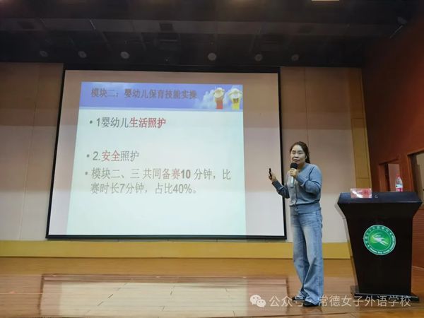 16日,2024 年湖南省“楚怡杯”职业院校技能竞赛婴幼儿照护赛项一等奖指导教师,湖南幼儿师范高等专科学校张宁惠老师在常德女子外语学校附属幼儿园音体室进行婴幼儿保育生活和安全照护技能实训指导。指导包含桌面消毒与清洁、卧具整理、头发梳理、婴儿沐浴、奶粉冲调与喂养、烫伤处理与预防、外出血的现场急救、急性食物中毒的现场急救八个方面,系统细致地为老师们演示讲解,为幼儿保育职业技能大赛中的实操项目提供了可视化标准。