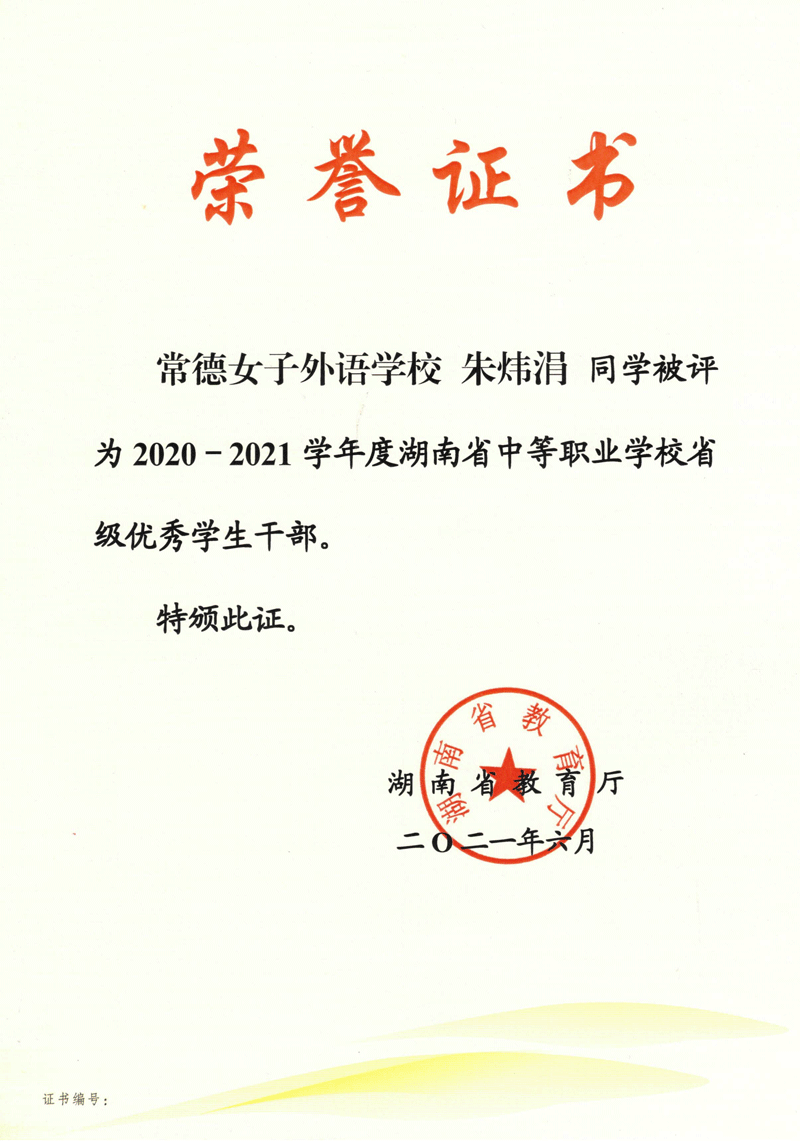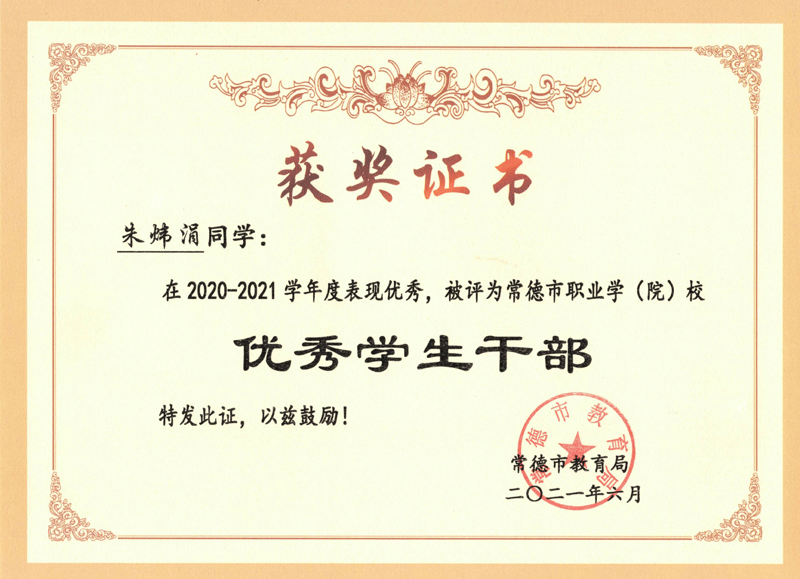 | 2020-2021年 | 朱炜涓 | 2020-2021学年常德市职业学校优秀学生干部 |