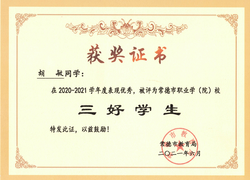| 2020-2021年 | 胡敏 | 2020-2021学年常德市职业学校三好学生 |