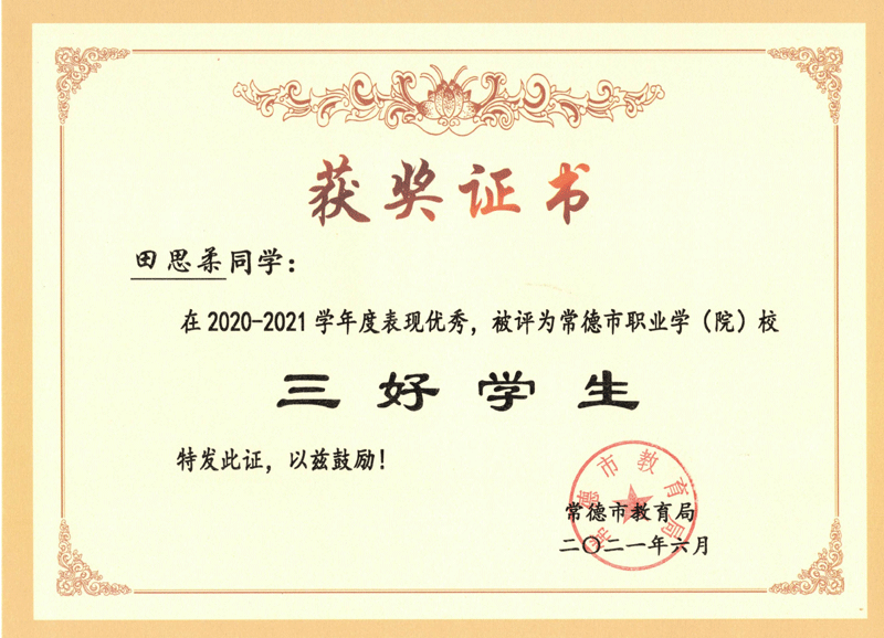 | 2020-2021年 | 田思柔 | 2020-2021学年常德市职业学校三好学生 |