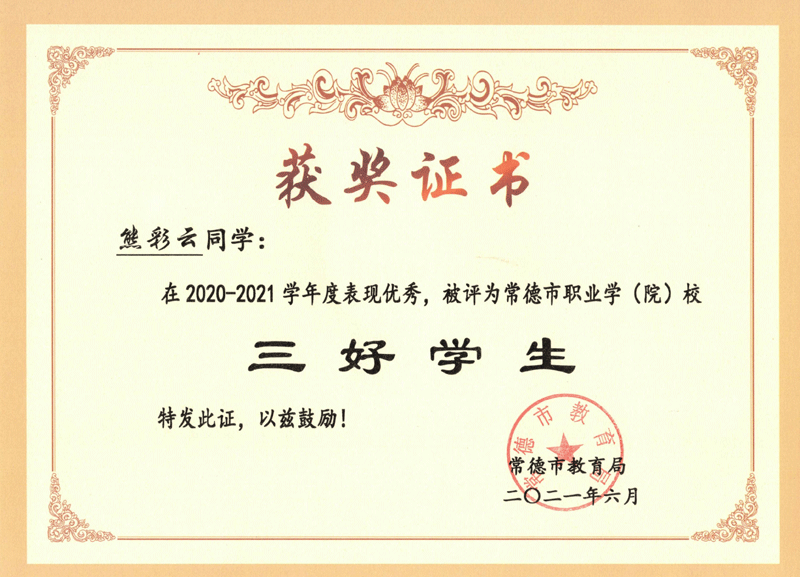 | 2020-2021年 | 熊彩云 | 2020-2021学年常德市职业学校三好学生 |