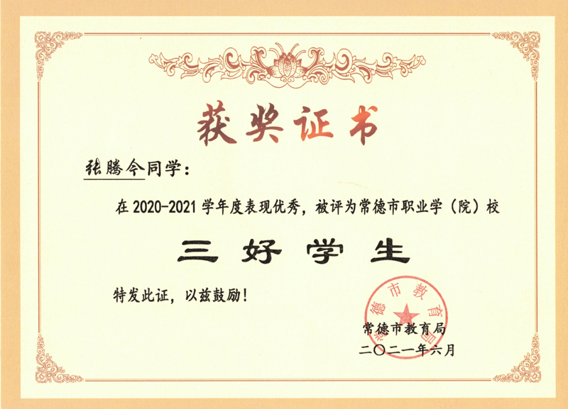 | 2020-2021年 | 张腾今 | 2020-2021学年常德市职业学校三好学生 |
